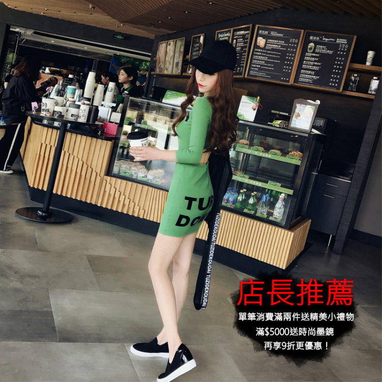 歐美性感綠字母休閒簍空收腰包臀連衣裙